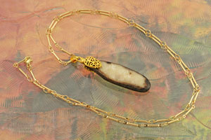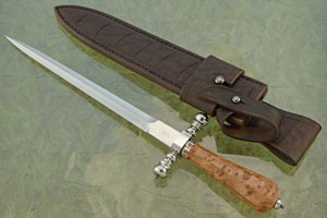 The 11-1/2 inch blade is a san mai combining a 15N20 carbon steel core with antique wrought iron sides that have been deeply etched and finished with an iron oxide patina. The contrast created between the core and jet black cladding is stunning! The poignard blade is hand ground with perfect symmetry and is razor sharp.