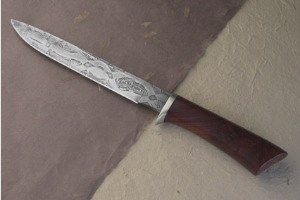 The 11-1/2 inch blade is a san mai combining a 15N20 carbon steel core with antique wrought iron sides that have been deeply etched and finished with an iron oxide patina. The contrast created between the core and jet black cladding is stunning! The poignard blade is hand ground with perfect symmetry and is razor sharp.