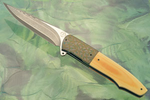 A glass bead blasted grade 5 titanium frame ensures this mid-size folder will be light in the pocket, yet have tremendous strength and durability. Each side features dyed and stabilized warthog tusk inlay. Screws throughout were made in the Arno Bernard workshop and are grade 4 titanium, allowing them to be anodized. Ensuring rigid, yet light construction, the backspacer is grade 5 titanium.