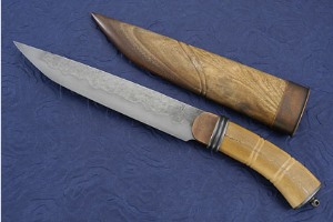 The 11-1/2 inch blade is a san mai combining a 15N20 carbon steel core with antique wrought iron sides that have been deeply etched and finished with an iron oxide patina. The contrast created between the core and jet black cladding is stunning! The poignard blade is hand ground with perfect symmetry and is razor sharp.