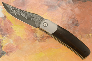 A glass bead blasted grade 5 titanium frame ensures this mid-size folder will be light in the pocket, yet have tremendous strength and durability. Each side features African blackwood (Dalbergia melanoxylon) inlay. The near-black wood has slight chocolate striations for a dramatic appearance. Screws throughout were made in the Arno Bernard workshop and are grade 4 titanium, allowing them to be anodized. Ensuring rigid, yet light construction, the backspacer is grade 5 titanium.