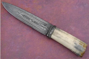 The 11-1/2 inch blade is a san mai combining a 15N20 carbon steel core with antique wrought iron sides that have been deeply etched and finished with an iron oxide patina. The contrast created between the core and jet black cladding is stunning! The poignard blade is hand ground with perfect symmetry and is razor sharp.