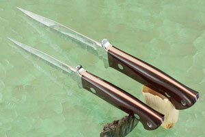 The larger knife is a Loveless 6" Dixon Fighter. The smaller is a Loveless Boot Knife. Both are made from premium RWL-34. RWL-34 is a powder metallurgy cutlery steel manufactured by ERASTEEL in Söderfors, Sweden. Because it is made from rapidly solidified powders, the microstructure of the steel is much more uniform. This gives the steel higher strength and resistance to cracks and chips. The blades feature a hollow boot grind. They are meticulously mirror polished.