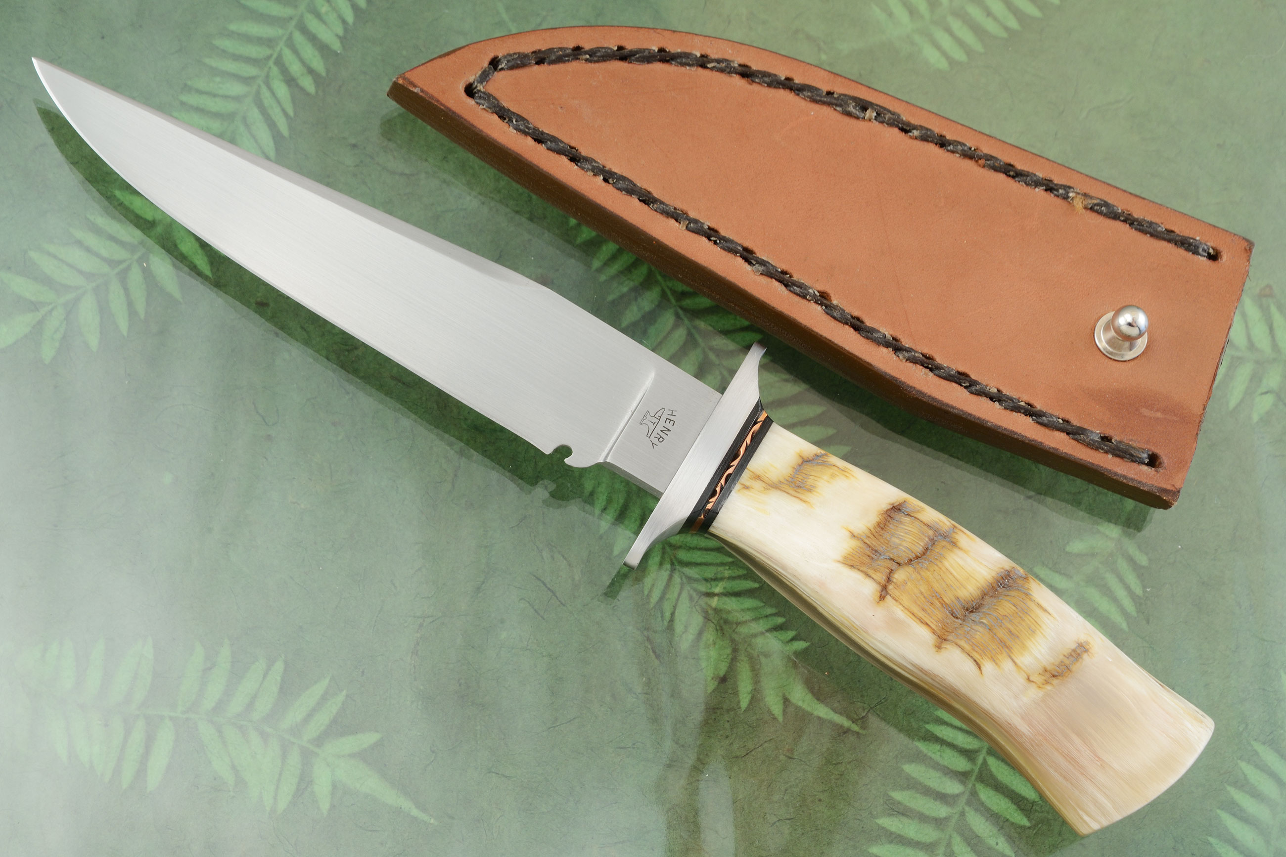 The handle is comprised of two pieces of expertly matched sheep horn in mortised tang construction - the seams are nearly imperceptible. Sheep horn is a perfect choice for use knives -- both because it is so durable and because rather than becoming slippery when wet, it becomes more 'grippy'. The handle is completed with hidden internal pins. A satin finished stainless steel guard prevents your hand from slipping forward onto the blade. Black fiber spacers assist the handle in adjusting to changes in temperature and humidity. A fileworked copper spacer brings warmth to the handle.