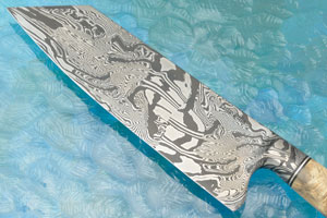 The handle is formed from presentation grade buckeye burl wood that is brought to a high polish. The convoluted wood is particularly beautiful. The stabilized buckeye burl will hold up well to the demands of either a professional or home kitchen. The right-handed, D-shaped (shinogi) handle is extremely comfortable and the knife has great balance. G10 and nickel silver spacers assist the handle adjust to humidity changes.