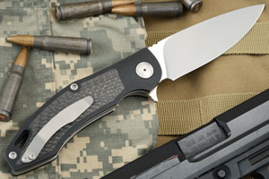 The handle is formed from black G10. Sections of carbon fiber are meticulously inlaid into each side. Anodized Gr6 titanium liners keep this full sized knife light yet strong. The backspacer is formed from black G10. The handle is completed with a titanium pocket clip mounted for right-handed, tip-up carry.