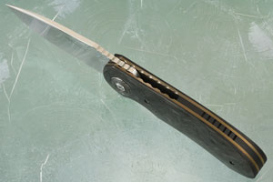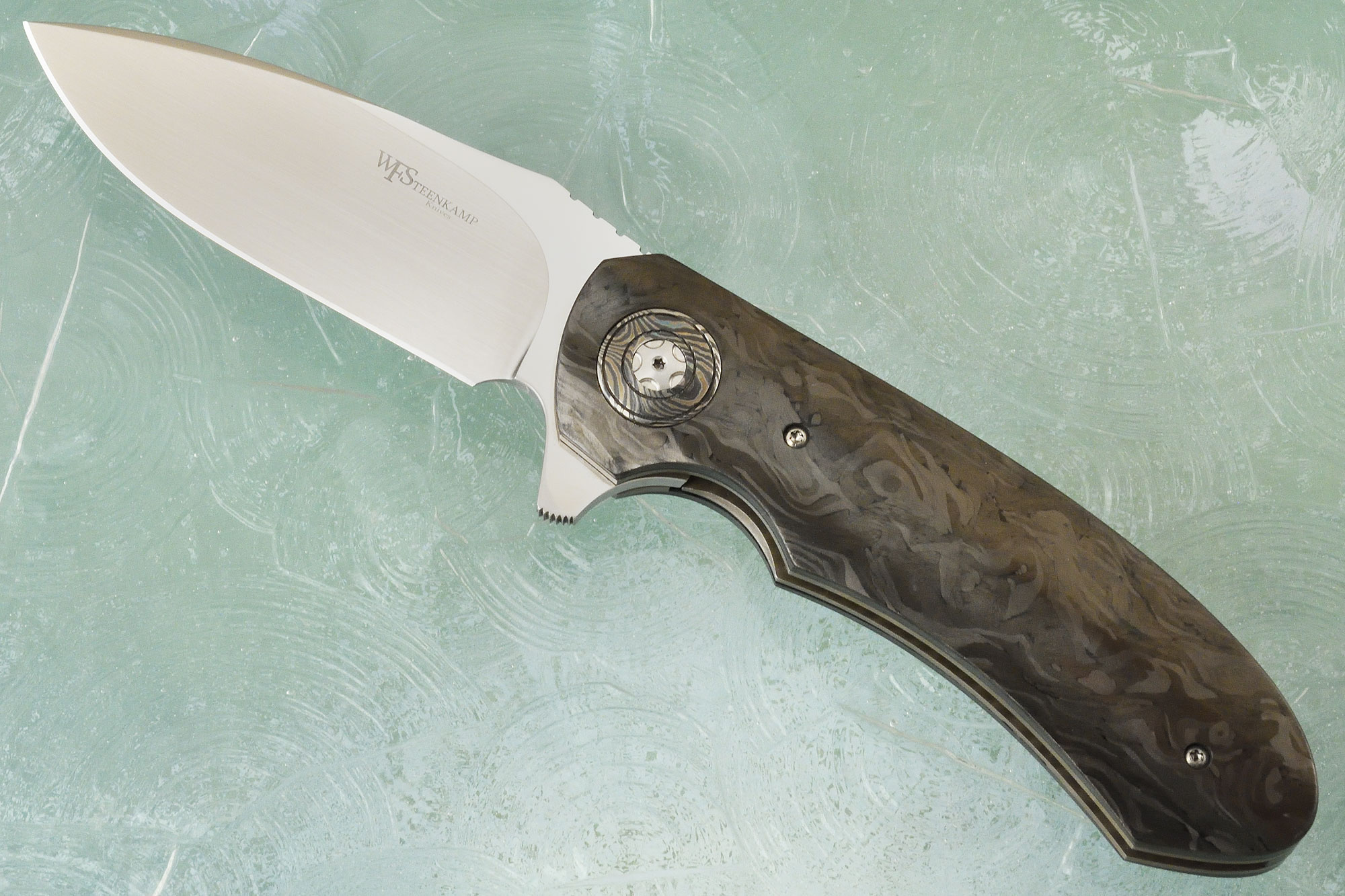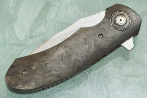 Handle scales are made from marble carbon fiber that has been domed to provide a comfortable grip. A black Timascus (Titanium/zirconium mokume) pivot collar surrounds the custom titanium pivot. Anodized titanium liners surround the carbon fiber backbar which keeps the knife strong, but light. The pocket clip is made from Black Timascus and is mounted for right-handed, tip-up carry.