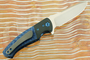 The handle combines blue twill scales with zirconium bolsters. Zirconium is a transitional metal that is primarily mined in South Africa and Australia. It is highly resistant to corrosion and scuffing. Blue anodized titanium liners keep the knife light, but strong. The liners surround a titanium backbar that has been notched to offer grip when pulling the knife from the pocket. All screws and hardware are matching blue anodized titanium. The blackened titanium pocket clip is mounted for right-handed, tip-up carry.
