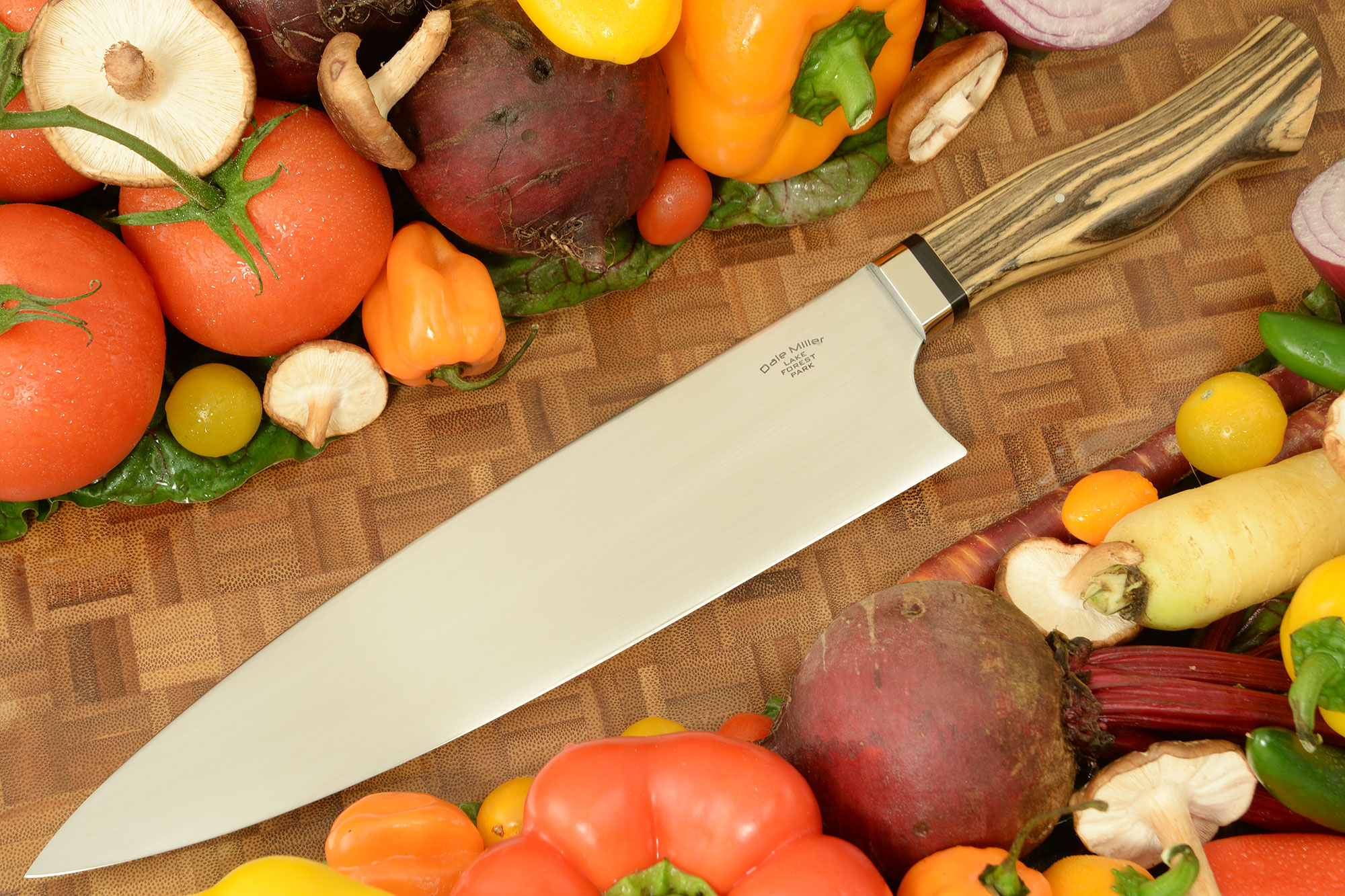 Description: The chef's knife is the primary knife used in the kitchen, easily handling almost all culinary tasks. This chef's knife by Dale Miller is light, agile, and very easy to maneuver. There's just enough belly curve to enable rocking cuts, which just adds to its versatility. Whether slicing, chopping or dicing, this chef's knife is sure to be a favorite in your kitchen!