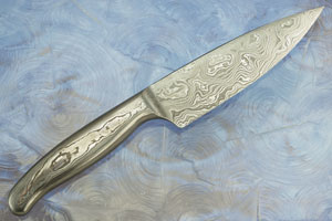 Description: Mastersmith Kevin Harvey began this elegant chef's utility by forging his own damascus to shape. By forging the damascus from carbon steels, Harvey ensures a keen, long lasting edge. This integral chef's knife is a perfect choice for slicing fruits, vegetables and meats as well an mincing herbs. It is sure to become a favorite in your kitchen.