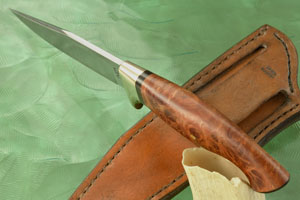 The handle is made from African wattle burl (Peltophorum africanum) matched with red bushwillow (Combretum apiculatum) accents. The contrast between the two woods provides a very elegant look. A silicon bronze bolster completes the handle. It is contoured to provide a comfortable grip even when the knife is used for long periods of time.
