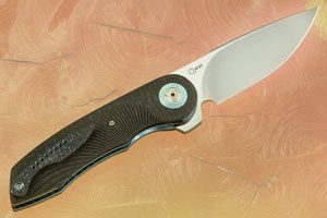 The scales are contoured and hand fluted carbon fiber. A terraced, anodized titanium pivot ring surrounds the titanium pivot. Blue anodized titanium liners and a carbon fiber backbar keep the knife light, yet strong. The blackened titanium pocket clip is mounted for right-handed, tip-up carry.