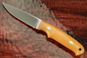 This handmade Bob Loveless Caper is an exceptionally rare and highly collectible knife. The blade features Bob's Lawndale, California football shaped mark on the left side of the blade. The steel is most likely either ATS-34 or 440C based on the maker's mark. #532 is carved into the ricasso of the knife. The blade is near-mint condition whith only a few minor sheath marks that are very hard to see. The blade appears to still have its original cutting edge and has never been sharpened or used to cut.