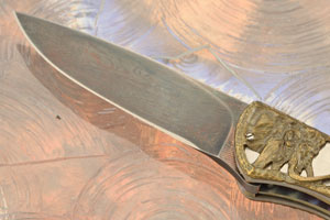 Product Description for Prehistoric Flipper with Heat Blued Damascus, Mammoth Molar, and Carved Bronze