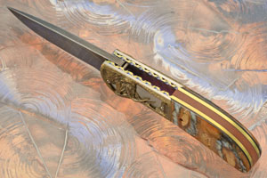 Handle scales are mammoth molar set on anodized titanium liners. The scales are dovetailed to bronze bolsters for a perfect fit. The left bolster is hand carved in the image of a mammoth. The right bolster is carved into a sabretooth tiger. The handle is nicely domed for a very comfortable feel in your hand. Anodized and hand fileworked titanium liners surround a natural Micarta backspacer. This knife only weighs 2.2 ounces. You won't notice it in your pocket until its needed.