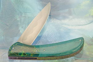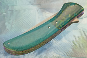 Handle scales are green dyed giraffe bone. They are nicely dovetailed to Arizona Jade TrueStone bolsters. Titanium liners are fileworked, anodized a bright purple, and jewel polished in the interior. They surround a fileworked bronze anodized titanium backbar. The inside of the backbar is engraved with Prinsloo's touchmark and an engraved cave painting motif. The lightly contoured scales feel great in hand.