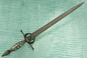 The handle combines a beautiful section of mammoth molar with fileworked and antiqued bronze. The damascus guard was carved by hand using jeweler's saws and shows off Neel's exceptional skills (and patience!). The antiqued bronze fittings show tremendous detail. This Parrying Dagger could easily be at the center piece of any collection!