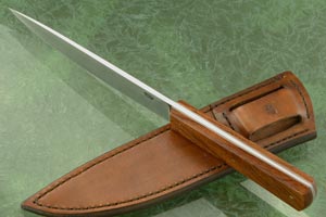 The knife is accompanied by a hand stitched, embossed cowhide sheath.