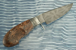 The contoured handle is made from presentation grade stabilized redwood burl. The rare wood has many dramatic eyes. The handle is a frame construction with an heirloom fit. The twist pattern damascus frame meets perfectly to the fluted damascus ferrule. The satin finished guard is 4116 stainless steel. The handle locks your fingers securely between the beak and guard. It is broad, providing a comfortable grip through hours of work. This knife is designed for someone who has a medium to smaller hand.