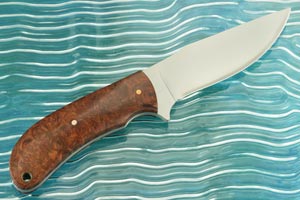 Stabilized amboyna burl handle scales are set on the full tang using copper pins and a lined lanyard hole. The scales are nicely domed for a secure, comfortable grip.
