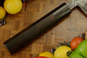 The ambidextrous Japanese-inspired half octagonal handle is faceted at the top and rounded at the base. This shape is among the most comfortable of traditional Japanese handle styles. The handle combines Macassar ebony with a buffalo horn ferrule.