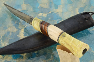 San Mai Damascus Swedish Hunting Knife with Maple Burl, Ironwood, and Mammoth Ivory