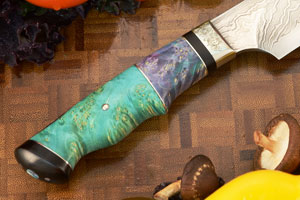 Mastersmith Kevin Harvey began this elegant chef's knife by forging his own damascus san mai. A central core of 52100 carbon steel is surrounded by random pattern damascus. Many knifemakers and knife users feel that 52100 is among the best steels used in modern knifemaking. By forging the damascus from carbon steels, Harvey ensures a keen, long lasting edge. A differential heat treatment adds strength and durability to the high performance blade.