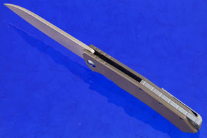 The blade runs on Trevor's in-house-made double row caged ceramic ball bearings and has silky-smooth action. Generally bearings are made either from tool steel or from stainless steel. Stainless steel can wear away, resulting in uneven action over time. Tool steel bearings can oxidize making the action rough. Ceramic bearings are the best of all worlds. Extremely hard and wear resistant, they are also inert and will not oxidize. The blade is easily opened single-handed using the flipper tab.