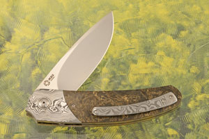 Handle scales are Gold Dark Matter FatCarbon, fit perfectly to Damasteel bolsters. Bronze anodized titanium liners surround a matching FatCarbon backbar. The 3D machined Damasteel pocket clip is mounted for right-side, tip-up carry.