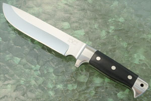 This massive camp knife is fully integral, meaning the blade, tang, and front and rear bolsters are made from one solid piece of steel. This gives the knife dramatically higher strength and durability. The blade is S-7 tool steel, well known for its high durability and shock resistance. The spine is a whopping 1/4 inch thick, but a deep hollow grind provides excellent slicing ability. Edmund's touchmark is on the left side of the blade.