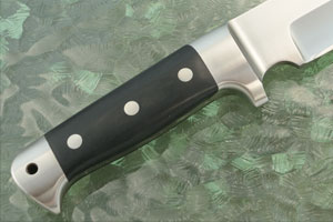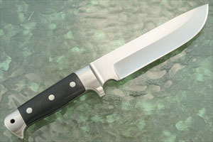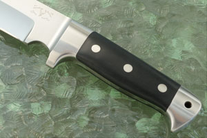 Handle scales are black canvas Micarta, secured to the full tang for strength and durability. Micarta is an excellent handle material for hard use knives due to its durability and ability to not get slippery when wet. A lanyard can be added to the rear of the knife if more retention is desired.