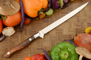 This high performance fillet knife is sure to become a 'goto' knife -- both in the kitchen and when out fishing. This beautiful knife is the right tool for two key tasks — boning and filleting. When boning, the narrow, sharp blade gets in close to the bone, making it easy to separate meat from bone. The extremely sharp edge even cuts through fibrous material with ease. It’s perfect for trimming the silverskin from a tenderloin or even making your own cutlets. The narrow blade reduces drag as you cut against the meat, so cutting is fast and easy. When it comes to filleting fish, the blade's 7-1/4 inch length is just right to glide through the body of the fish, quickly removing bones and skin.