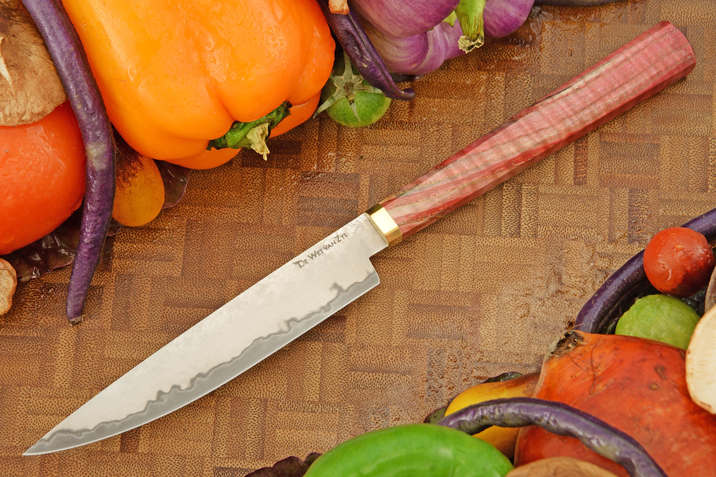 The Japanese inspired octagonal handle is dyed and stabilized curly maple. The slim handle feels great in your hand and is very lightweight. A brass bolster seals the handle and prevents food or water from getting in. Like other knives, this knife should not be put in the dishwasher.