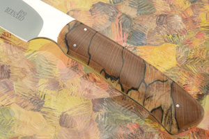 The dramatic handle is stabilized spalted oak, set on the full tang using stainless steel pins. This sturdy knife is comfortable to hold and has excellent balance. From skinning, to field processing, to cooking around the campsite, this knife has you covered!