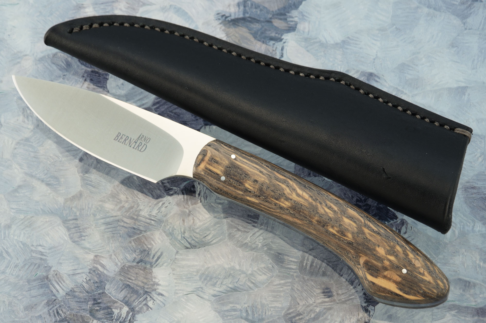 The blade on this drop point hunter is hand ground Bohler N690 stainless steel. N690 takes an incredibly sharp edge and holds onto it. Increased toughness gives it better resistance to edge chipping. The blade is hollow ground to a high-performance edge. A differential satin finish shows off Arno's clean hand grinds.