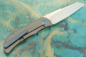 The handle is bead blasted Grade 5 titanium. Trevor's maker mark is engraved into the inside of the handle. The 3D machined titanium pocket clip is mounted for right-side, tip-up carry.