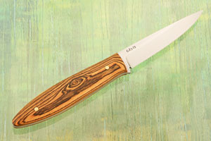 The handle is bocote secured to a full tang using two brass pins. The compact handle fills your hand nicely and feels great.