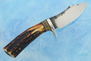 The handle is stag, retaining much of its natural texture for excellent grip. Micarta spacers separate the stag handle from the stainless steel guard. This knife is lightweight, easy to carry, and feels great in hand!