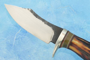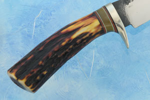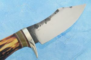 The blade is hand forged 1084 carbon steel. 1084 carbon steel is tough, chip resistant, and maintains excellent edge holding. The blade features a hand rubbed satin finish in the grinds and forge texturing on the flats. Will's touchmark is on the right side of the blade. Because this knife is forged from carbon steel, we recommend using camellia oil to protect the blade and natural stag handle.