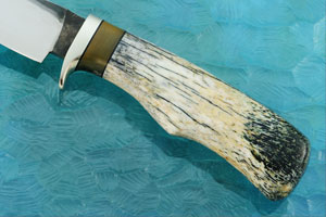 The blade is hand forged 1084 carbon steel. 1084 carbon steel is tough, chip resistant, and maintains excellent edge holding. The blade features a hand rubbed satin finish in the grinds and forge texturing on the flats. Will's touchmark is on the right side of the blade. Because this knife is forged from carbon steels, we recommend using camellia oil to oil the blade and natural stag handle.