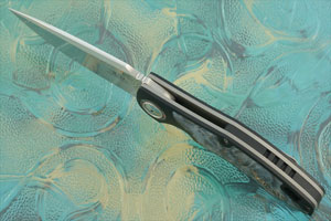 Black G10 handle scales are inlaid with dyed and stabilized maple burl. Bead blasted Gr6 titanium liners keep this full sized knife light yet strong. The backspacer is black G10. Raised stainless steel collars surround the pivot. The handle is completed with a bead blasted titanium pocket clip mounted for right-side, tip-up carry.