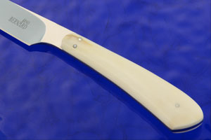 Warthog tusk handle scales are set to the full tang using stainless steel pins. The knife is very lightweight (just 2 oz!) and comfortable to hold, making it perfect for a daily carry fixed blade. From caping to fowl and fish, this bird & trout knife will be a tremendous piece out in the field.