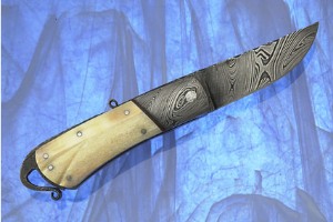 Description: Daniel Winkler and Karen shook create works of art that will soon become family heirlooms. They have been a large part of defining the primitive knife movement in the United States. Flourishes such as the fileworked Damascus spine and backbar Fileworked spine create knives that capture your imagination. This friction folder features a twist used to open and close the blade as well as on the butt. The sculpted mammoth ivory has been sculpted and is ornamented by six pins and black and white spacers. The pivot pin has been hammered for ornamentation.