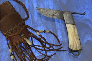 Sheath: The rawhide and deer hide sheath designed for either belt or neck wearing is created by Karen Shook. Leather with fringe beaded with glass and fossil ivory beads