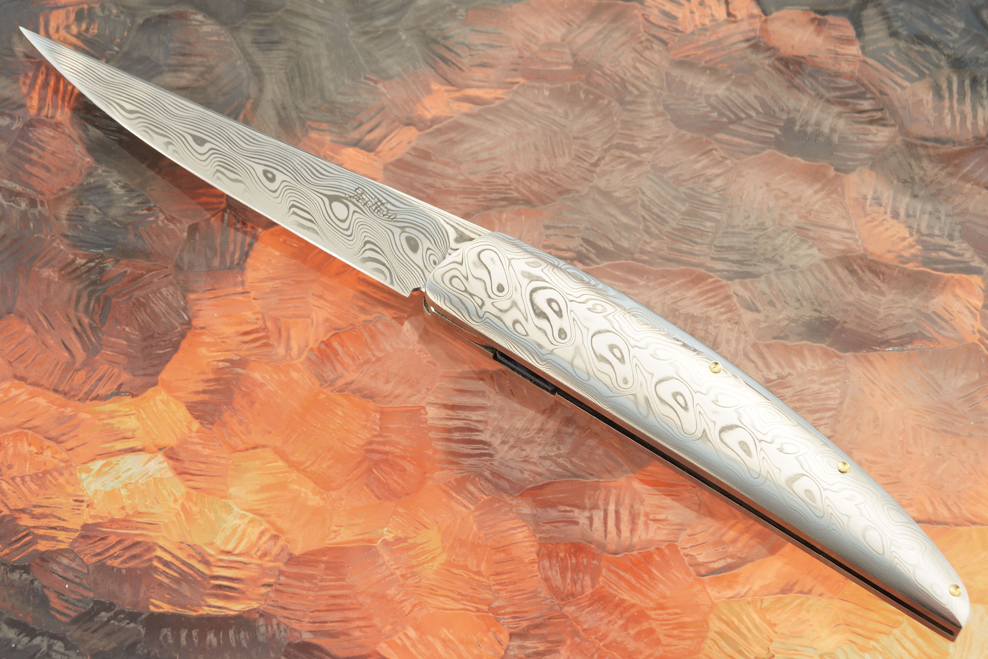 The blade is Swedish Damasteel which has been double tempered and cryogenically treated in liquid nitrogen. This style of heat treatment results in an incredibly long lasting edge, and high resistance to chipping. The blade is perfectly centered and has smooth action. It is easily opened using the front flipper mechanism. This style of flipper doesn't catch on things in the pocket and is designed to be opened with a rotating motion of your thumb or index finger, though it can be 'flicked' with practice. The inlaid lock bar is grade V titanium with a silicon nitride detent ball (Hrc 93!).