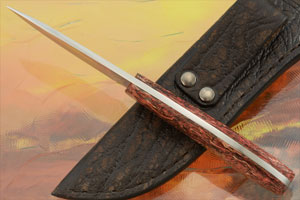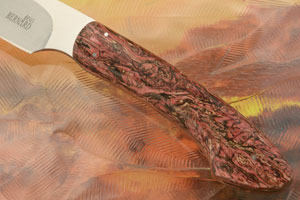 The dramatic handle scales are dyed and stabilized hemp fibers, suspended in resin. The scales are set on the full tang using stainless steel pins. This sturdy knife is comfortable to hold and has excellent balance. From skinning, to field processing, to cooking around the campsite, this knife has you covered!