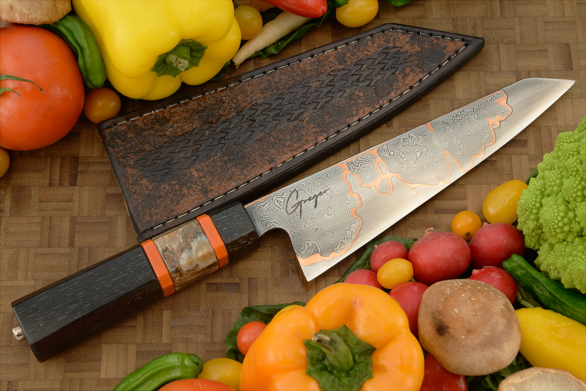 The Japanese-inspired ambidextrous octagonal handle combines ancient bog oak with mammoth molar. This wood has been buried in a bog for hundreds or sometimes thousands of years. The extremely low oxygen conditions of the bog protect the wood from normal decay, while the underlying peat provides acidic conditions where iron salts and other minerals react with tannins in the wood, gradually giving it a distinct dark brown to almost black color. Orange G-10 spacers surround the mammoth molar and complement the copper in the blade well. The handle is finished with a mokume finial (forged from copper and nickel) at the end of the handle.
