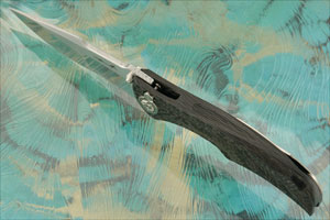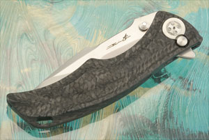 The ergonomic carbon fiber handle is fluted, providing a beautiful, yet incredibly comfortable grip. Most makers would have created two slabs of carbon fiber and set a spacer material in between. This integral handle is machined from one solid piece of carbon fiber, showing Brian's tremendous skill as a machinist. This construction keeps the knife incredibly lightweight while providing exceptional durability and strength. A titanium pivot collar surrounds the custom pivot. The knife is finished with a matching fluted titanium deep carry pocket clip that is mounted for right-side, tip-up carry.