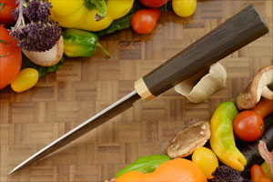 The blade is hand forged Aogami Super with stainless cladding. Aogami Super is highly prized in Japan and provides exceptional edge holding. A forge finish along the top of the blade helps facilitate food release when cutting foods. The blade edge geometry is very thin and will cut foods efficiently with little resistance. The non-reactive cladding makes this knife easier to care for.
