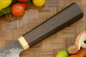 The Japanese-inspired octagonal handle is fumed oak. A brass ferrule seals the front of the handle from food and water. The handle is extremely comfortable and accommodates a pinch grip well. Like other knives, this knife should not be put in the dishwasher.